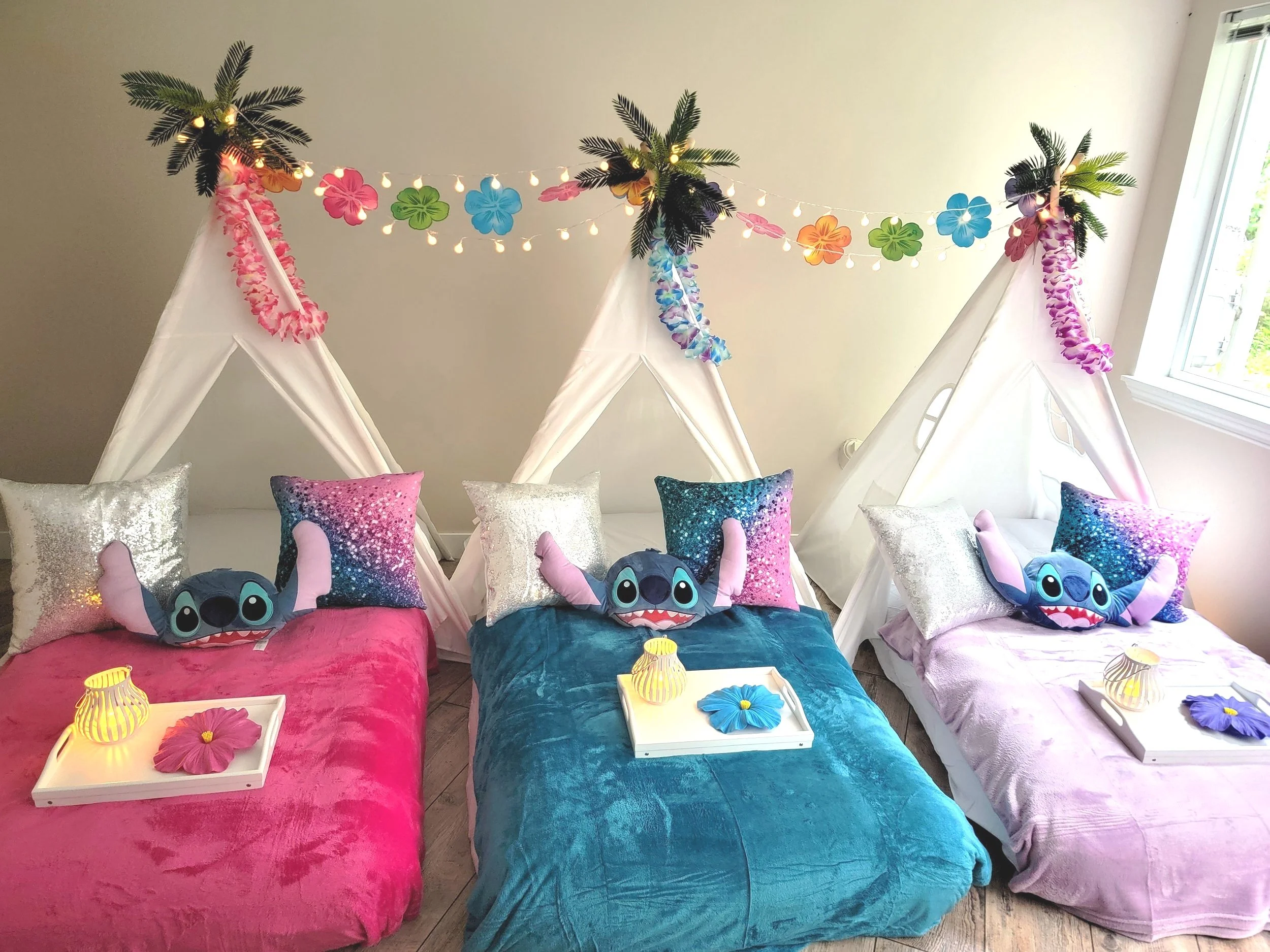 Our tents are designed to create a cozy and magical atmosphere inside your home. Whether you are celebrating a birthday, team party or other special occasion, our team will work closely with you to provide a unique, unforgettable event. We provide themed decorations, comfortable bedding, and special extras to ensure a night of unforgettable fun and relaxation for all attendees.